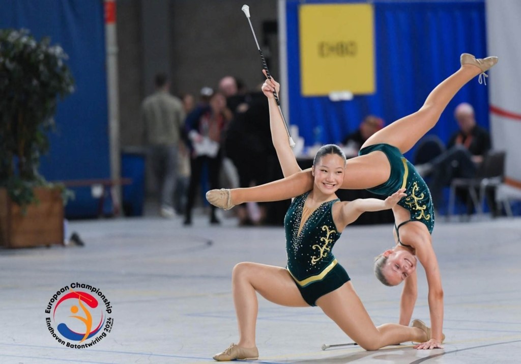 Hannah Suithapar (14) og Maria Victoria Rise (14) fra Stathelle Drill representerte Norge under Europamesterskapet i Drill i påska 2024 i Eindhoven i Nederland.