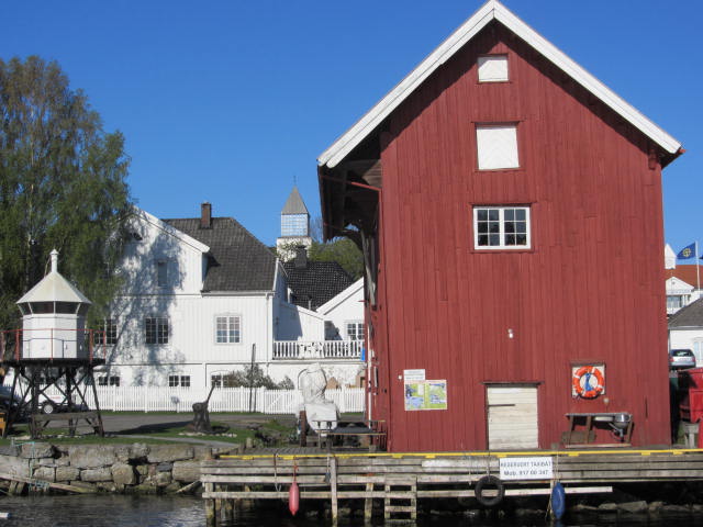 Cudrio sjøbod. På bildet under, i bakgrunnen til venstre ser en kirketårnet. Det nærmeste, hvite huset er Victora Gjestgiveri.