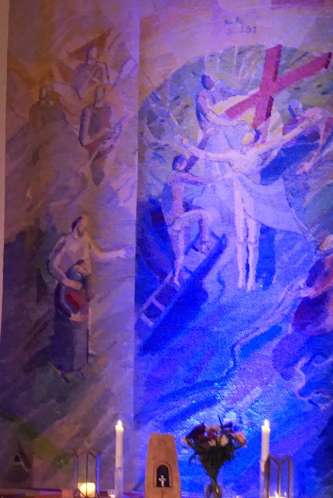 I den nye kirken er den typiske altertavlen erstattet med et teppe på veggen bak alteret. Det mest dominerende motivet viser Jesu nedtakelse fra korset, altså det samme motivet som på altertavlen i gamlekirken.